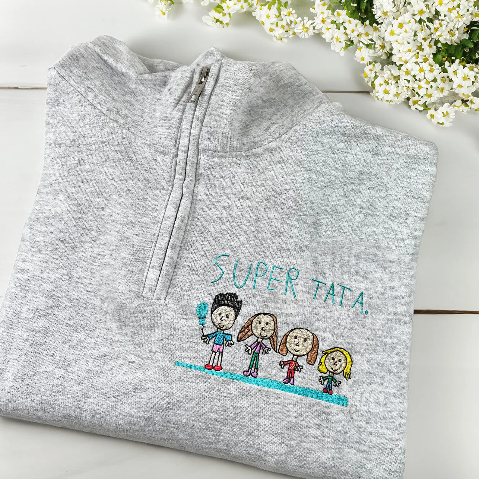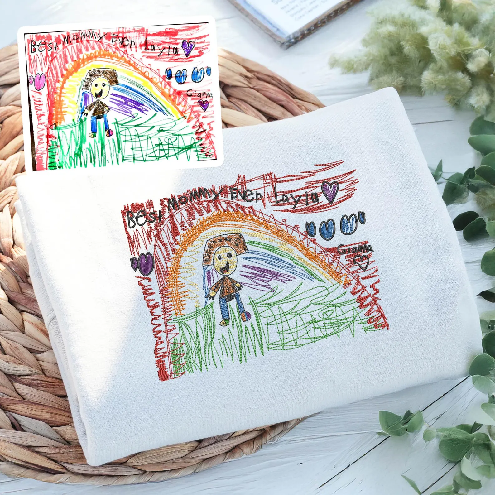 Tworzymy hafty na podstawie dziecięcych rysunków, przekształcając kartkę papieru w wyjątkową bluzę — osobistą, wzruszającą, niepowtarzalną. To coś więcej niż ubranie — to wspomnienie, które możesz nosić blisko serca, codziennie.